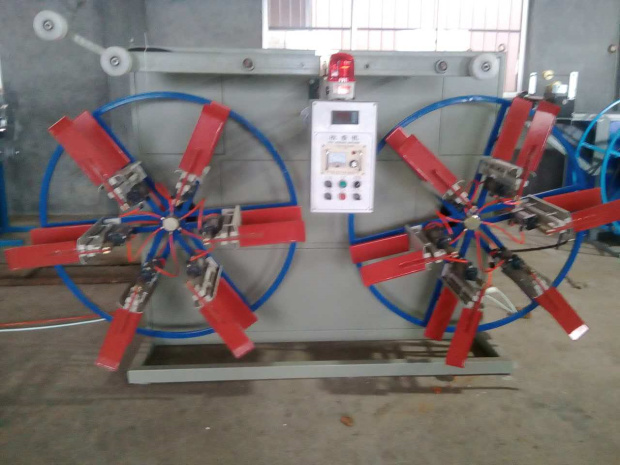 收卷時,推板油缸處于后縮位置,推板后移,漲力頭外露,漲縮油缸后縮,通過拉桿拉動擴漲器使漲力頭弓形板向外撐開,此時漲力頭外徑410/508mm,連接鋼板即可收卷。